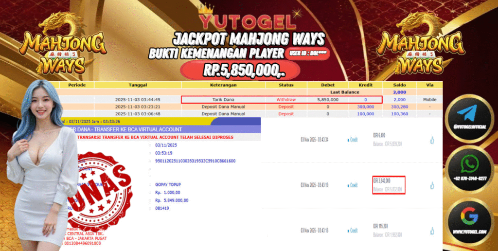 Selamat kepada User id : BOL*** Bukti Pembayaran Kemenangan 5.850,000 permainan SLOT PG SOFT USER ID : BOL*** LUNAS!!!  Telah berhasil mendapatkan kemenangan besar pada JACKPOT PERMAINAN PG SOFT , RP 5.850,000,- LUNAS . Setelah mengisi formulir withdraw dengan kurung waktu hanya 5 – 10 menit pihak  YUTOGEL sudah melakukan transfer kepada pemilik Userid dan dana sudah dapat dicairkan oleh pemenang. Bukti pembayaran yang kami berikan merupakan bukti pembayaran yang SAH/VALID yang langsung di dapatkan melalui tanda transfer transaksi dari Bank yang dituju.