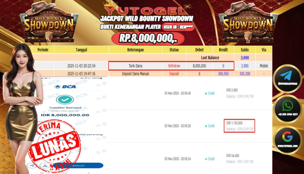Selamat kepada User id : REN*** Bukti Pembayaran Kemenangan 8.000,000 permainan SLOT PG SOFT USER ID : REN*** LUNAS!!!  Telah berhasil mendapatkan kemenangan besar pada JACKPOT PERMAINAN PG SOFT , RP 8.000,000,- LUNAS . Setelah mengisi formulir withdraw dengan kurung waktu hanya 5 – 10 menit pihak  YUTOGEL sudah melakukan transfer kepada pemilik Userid dan dana sudah dapat dicairkan oleh pemenang. Bukti pembayaran yang kami berikan merupakan bukti pembayaran yang SAH/VALID yang langsung di dapatkan melalui tanda transfer transaksi dari Bank yang dituju.