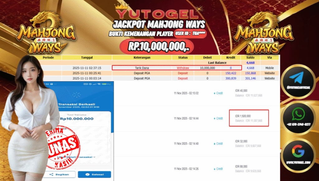 Selamat kepada User id : TUA*** Bukti Pembayaran Kemenangan 10.000,000 permainan SLOT PG SOFT USER ID : TUA*** LUNAS!!! Telah berhasil mendapatkan kemenangan besar pada JACKPOT PERMAINAN PG SOFT , RP 10.000,000,- LUNAS . Setelah mengisi formulir withdraw dengan kurung waktu hanya 5 – 10 menit pihak YUTOGEL sudah melakukan transfer kepada pemilik User id dan dana sudah dapat dicairkan oleh pemenang. Bukti pembayaran yang kami berikan merupakan bukti pembayaran yang SAH/VALID yang langsung di dapatkan melalui tanda transfer transaksi dari Bank yang dituju.