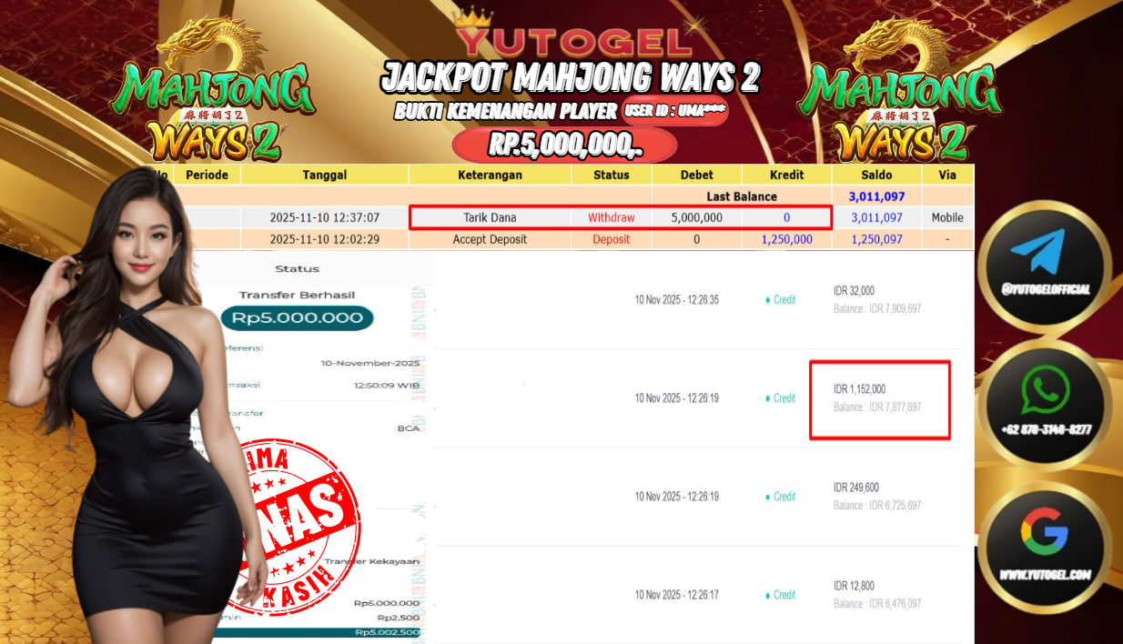 Selamat kepada User id : UMA*** Bukti Pembayaran Kemenangan 5.000,000 permainan SLOT PG SOFT USER ID : UMA*** LUNAS!!! Telah berhasil mendapatkan kemenangan besar pada JACKPOT PERMAINAN PG SOFT , RP 5.000,000,- LUNAS . Setelah mengisi formulir withdraw dengan kurung waktu hanya 5 – 10 menit pihak YUTOGEL sudah melakukan transfer kepada pemilik User id dan dana sudah dapat dicairkan oleh pemenang. Bukti pembayaran yang kami berikan merupakan bukti pembayaran yang SAH/VALID yang langsung di dapatkan melalui tanda transfer transaksi dari Bank yang dituju.