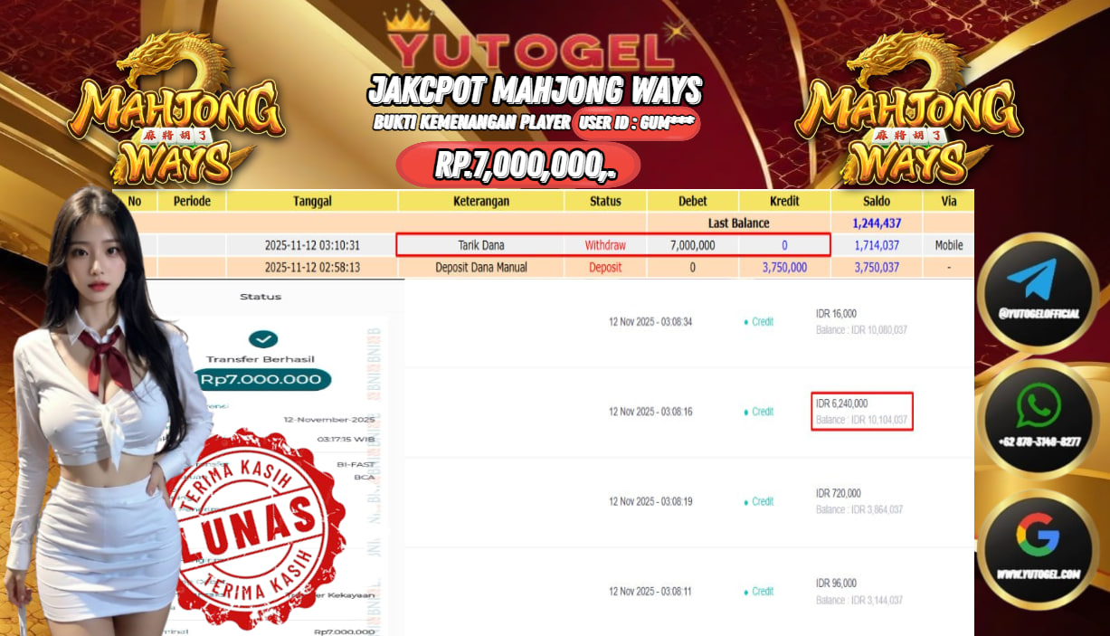 Selamat kepada User id : GUM*** Bukti Pembayaran Kemenangan 7.000,000 permainan SLOT PG SOFT USER ID : GUM*** LUNAS!!! Telah berhasil mendapatkan kemenangan besar pada JACKPOT PERMAINAN PG SOFT , RP 7.000,000,- LUNAS . Setelah mengisi formulir withdraw dengan kurung waktu hanya 5 – 10 menit pihak YUTOGEL sudah melakukan transfer kepada pemilik User id dan dana sudah dapat dicairkan oleh pemenang. Bukti pembayaran yang kami berikan merupakan bukti pembayaran yang SAH/VALID yang langsung di dapatkan melalui tanda transfer transaksi dari Bank yang dituju.