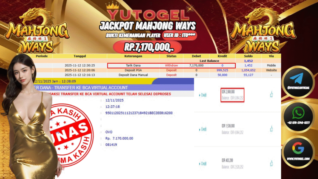 Selamat kepada User id : ITO*** Bukti Pembayaran Kemenangan 7.170,000 permainan SLOT PG SOFT USER ID : ITO*** LUNAS!!! Telah berhasil mendapatkan kemenangan besar pada JACKPOT PERMAINAN PG SOFT , RP 7.170,000,- LUNAS . Setelah mengisi formulir withdraw dengan kurung waktu hanya 5 – 10 menit pihak YUTOGEL sudah melakukan transfer kepada pemilik User id dan dana sudah dapat dicairkan oleh pemenang. Bukti pembayaran yang kami berikan merupakan bukti pembayaran yang SAH/VALID yang langsung di dapatkan melalui tanda transfer transaksi dari Bank yang dituju.