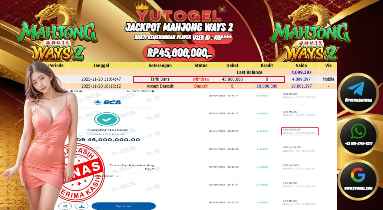Selamat kepada User id : KOP*** Bukti Pembayaran Kemenangan 45.000,000 permainan SLOT PG SOFT USER ID : KOP*** LUNAS!!!  Telah berhasil mendapatkan kemenangan besar pada JACKPOT PERMAINAN PG SOFT , RP 45.000,000,- LUNAS . Setelah mengisi formulir withdraw dengan kurung waktu hanya 5 – 10 menit pihak  YUTOGEL sudah melakukan transfer kepada pemilik User id dan dana sudah dapat dicairkan oleh pemenang. Bukti pembayaran yang kami berikan merupakan bukti pembayaran yang SAH/VALID yang langsung di dapatkan melalui tanda transfer transaksi dari Bank yang dituju.