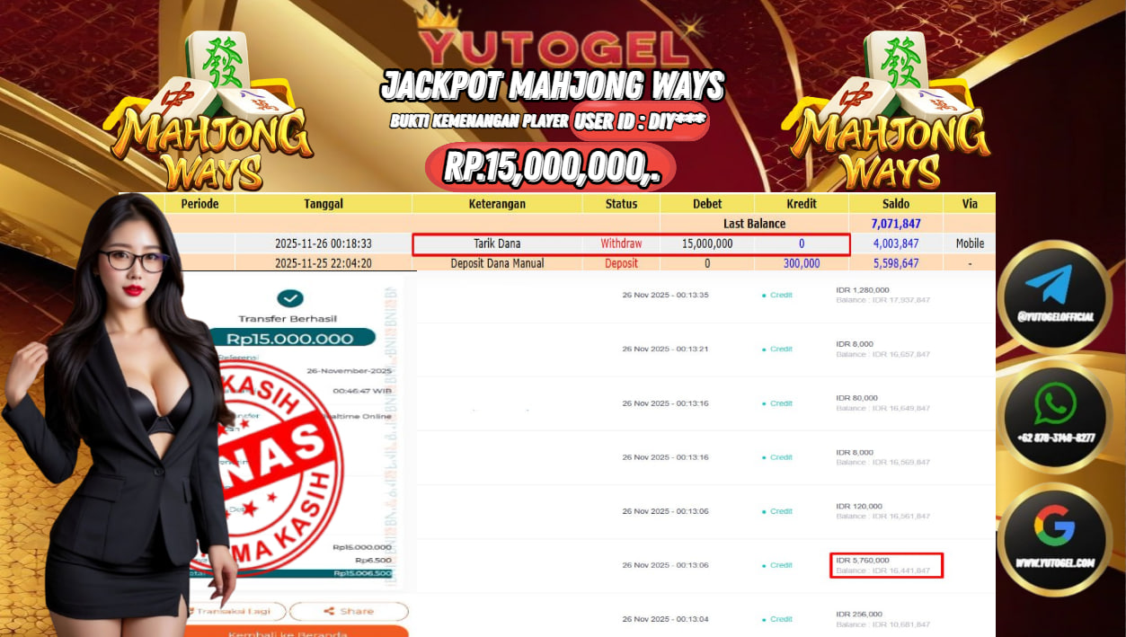 Selamat kepada User id : DIY*** Bukti Pembayaran Kemenangan 15.000,000 permainan SLOT PG SOFT USER ID : DIY*** LUNAS!!! Telah berhasil mendapatkan kemenangan besar pada JACKPOT PERMAINAN PG SOFT , RP 15.000,000,- LUNAS . Setelah mengisi formulir withdraw dengan kurung waktu hanya 5 – 10 menit pihak YUTOGEL sudah melakukan transfer kepada pemilik User id dan dana sudah dapat dicairkan oleh pemenang. Bukti pembayaran yang kami berikan merupakan bukti pembayaran yang SAH/VALID yang langsung di dapatkan melalui tanda transfer transaksi dari Bank yang dituju.