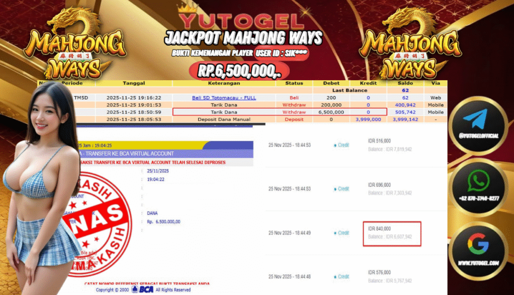Selamat kepada User id : SIK*** Bukti Pembayaran Kemenangan 6.500,000 permainan SLOT PG SOFT USER ID : SIK*** LUNAS!!!  Telah berhasil mendapatkan kemenangan besar pada JACKPOT PERMAINAN PG SOFT , RP 6.500,000,- LUNAS . Setelah mengisi formulir withdraw dengan kurung waktu hanya 5 – 10 menit pihak  YUTOGEL sudah melakukan transfer kepada pemilik User id dan dana sudah dapat dicairkan oleh pemenang. Bukti pembayaran yang kami berikan merupakan bukti pembayaran yang SAH/VALID yang langsung di dapatkan melalui tanda transfer transaksi dari Bank yang dituju.