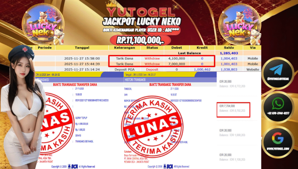 Selamat kepada User id : ADE*** Bukti Pembayaran Kemenangan 11.100,000 permainan SLOT PG SOFT USER ID : ADE*** LUNAS!!!  Telah berhasil mendapatkan kemenangan besar pada JACKPOT PERMAINAN PG SOFT , RP 11.100,000,- LUNAS . Setelah mengisi formulir withdraw dengan kurung waktu hanya 5 – 10 menit pihak  YUTOGEL sudah melakukan transfer kepada pemilik User id dan dana sudah dapat dicairkan oleh pemenang. Bukti pembayaran yang kami berikan merupakan bukti pembayaran yang SAH/VALID yang langsung di dapatkan melalui tanda transfer transaksi dari Bank yang dituju.