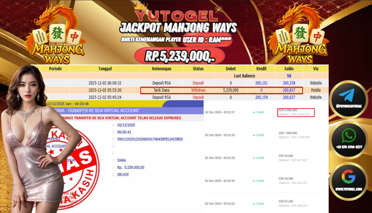Selamat kepada User id : RAM*** Bukti Pembayaran Kemenangan 5.239,000 permainan SLOT PG SOFT USER ID : RAM*** LUNAS!!! Telah berhasil mendapatkan kemenangan besar pada JACKPOT PERMAINAN PG SOFT , RP 5.239,000,- LUNAS . Setelah mengisi formulir withdraw dengan kurung waktu hanya 5 – 10 menit pihak YUTOGEL sudah melakukan transfer kepada pemilik User id dan dana sudah dapat dicairkan oleh pemenang. Bukti pembayaran yang kami berikan merupakan bukti pembayaran yang SAH/VALID yang langsung di dapatkan melalui tanda transfer transaksi dari Bank yang dituju.