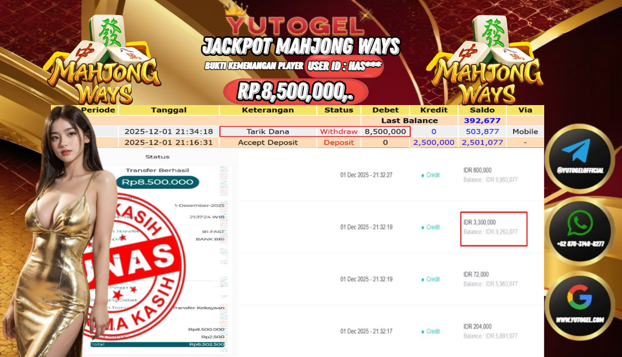 Selamat kepada User id : HAN*** Bukti Pembayaran Kemenangan 8.500,000 permainan SLOT PG SOFT USER ID : HAN*** LUNAS!!! Telah berhasil mendapatkan kemenangan besar pada JACKPOT PERMAINAN PG SOFT , RP 8.500,000,- LUNAS . Setelah mengisi formulir withdraw dengan kurung waktu hanya 5 – 10 menit pihak YUTOGEL sudah melakukan transfer kepada pemilik User id dan dana sudah dapat dicairkan oleh pemenang. Bukti pembayaran yang kami berikan merupakan bukti pembayaran yang SAH/VALID yang langsung di dapatkan melalui tanda transfer transaksi dari Bank yang dituju.