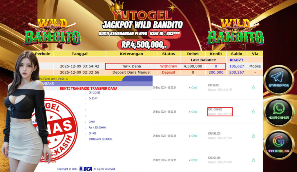 Selamat kepada User id : BOS**** Bukti Pembayaran Kemenangan 4.500,000 permainan SLOT PG SOFT USER ID : BOS**** LUNAS!!! Telah berhasil mendapatkan kemenangan besar pada JACKPOT PERMAINAN PG SOFT , RP 4.500,000,- LUNAS . Setelah mengisi formulir withdraw dengan kurung waktu hanya 5 – 10 menit pihak YUTOGEL sudah melakukan transfer kepada pemilik User id dan dana sudah dapat dicairkan oleh pemenang. Bukti pembayaran yang kami berikan merupakan bukti pembayaran yang SAH/VALID yang langsung di dapatkan melalui tanda transfer transaksi dari Bank yang dituju.