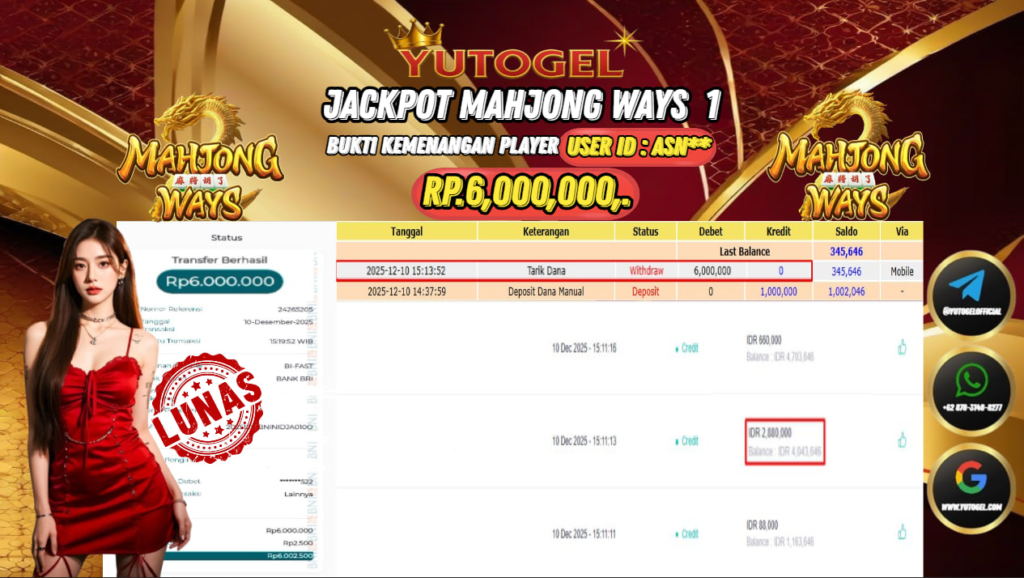 Selamat kepada User id : ANS**** Bukti Pembayaran Kemenangan 6,000,000 permainan SLOT PG SOFT USER ID : ANS**** LUNAS!!! Telah berhasil mendapatkan kemenangan besar pada JACKPOT PERMAINAN PG SOFT , RP 6,000,000,- LUNAS . Setelah mengisi formulir withdraw dengan kurung waktu hanya 5 – 10 menit pihak YUTOGEL sudah melakukan transfer kepada pemilik User id dan dana sudah dapat dicairkan oleh pemenang. Bukti pembayaran yang kami berikan merupakan bukti pembayaran yang SAH/VALID yang langsung di dapatkan melalui tanda transfer transaksi dari Bank yang dituju.