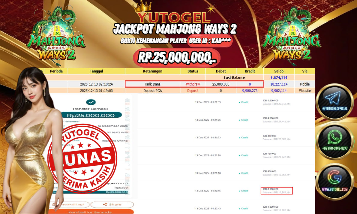 Selamat kepada USER ID : KAD**** Telah berhasil mendapatkan kemenangan besar pada YUTOGEL JACKPOT SLOT PGSOFT MAHJONG WAYS 2 RP. 25.000.000,. – LUNAS. Setelah mengisi formulir withdraw dengan kurung waktu hanya 5 – 10 menit pihak sudah melakukan transfer kepada pemilik User id dan dana sudah dapat dicairkan oleh pemenang. Bukti pembayaran yang kami berikan merupakan bukti pembayaran yang SAH/VALID yang langsung di dapatkan melalui tanda transfer transaksi dari Bank yang dituju.