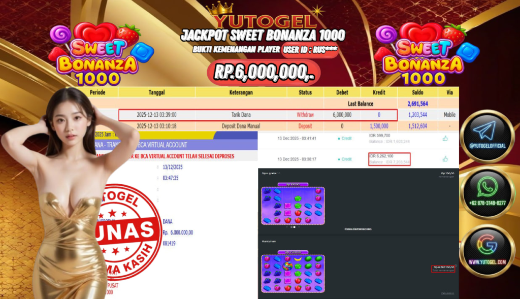 Selamat kepada USER ID : RUS*** Telah berhasil mendapatkan kemenangan besar pada YUTOGEL JACKPOT SLOT PRAGMATIC PLAY SWEET BONANZA 1000 RP. 6.000.000,. – LUNAS. Setelah mengisi formulir withdraw dengan kurung waktu hanya 5 – 10 menit pihak  sudah melakukan transfer kepada pemilik Userid dan dana sudah dapat dicairkan oleh pemenang. Bukti pembayaran yang kami berikan merupakan bukti pembayaran yang SAH/VALID yang langsung di dapatkan melalui tanda transfer transaksi dari Bank yang dituju.