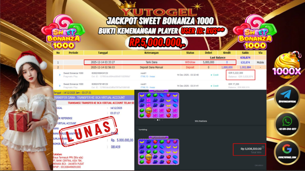 Selamat kepada USER ID : RUS*** Telah berhasil mendapatkan kemenangan besar pada YUTOGEL JACKPOT SLOT PRAGMATIC PLAY SWEET BONANZA 1000 RP. 5.000.000,. – LUNAS. Setelah mengisi formulir withdraw dengan kurung waktu hanya 5 – 10 menit pihak sudah melakukan transfer kepada pemilik Userid dan dana sudah dapat dicairkan oleh pemenang. Bukti pembayaran yang kami berikan merupakan bukti pembayaran yang SAH/VALID yang langsung di dapatkan melalui tanda transfer transaksi dari Bank yang dituju.