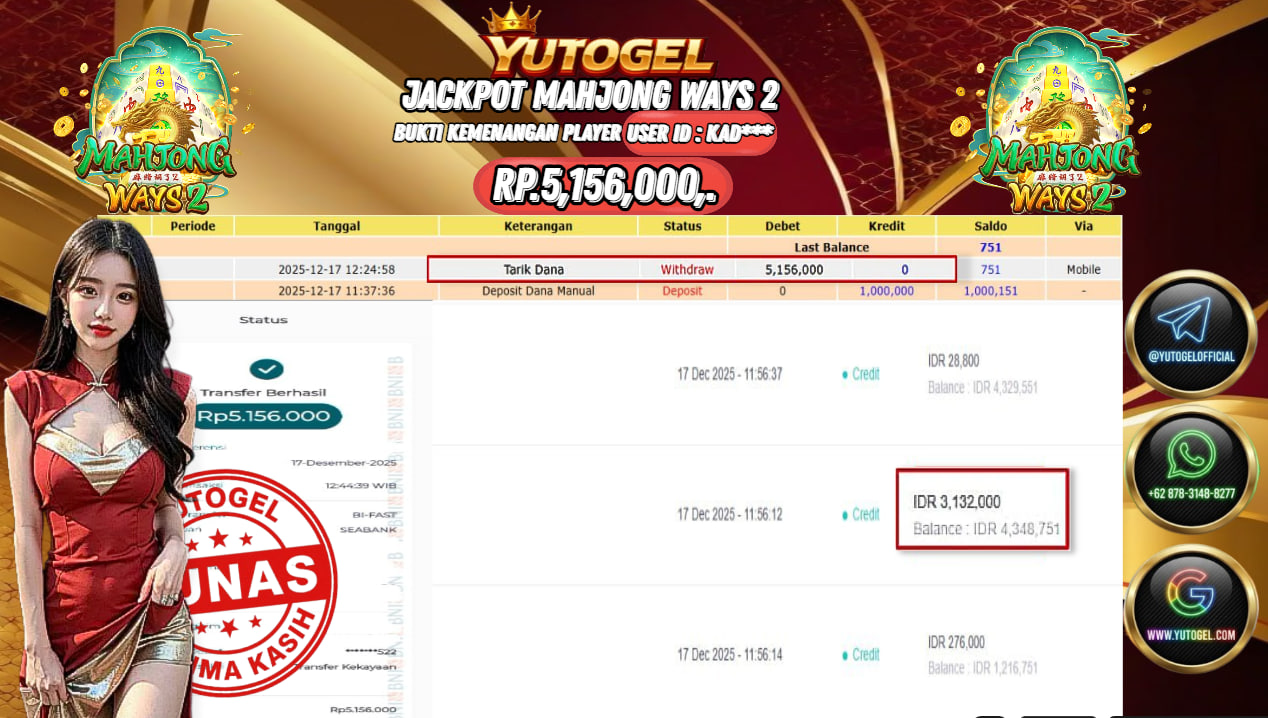 Selamat kepada USER ID : KAD**** Telah berhasil mendapatkan kemenangan besar pada YUTOGEL JACKPOT SLOT PGSOFT MAHJONG WAYS 2 RP. 5.156.000,. – LUNAS. Setelah mengisi formulir withdraw dengan kurung waktu hanya 5 – 10 menit pihak  sudah melakukan transfer kepada pemilik User id dan dana sudah dapat dicairkan oleh pemenang. Bukti pembayaran yang kami berikan merupakan bukti pembayaran yang SAH/VALID yang langsung di dapatkan melalui tanda transfer transaksi dari Bank yang dituju.