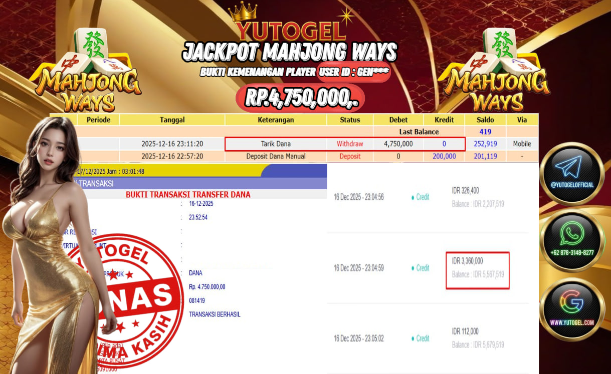 Selamat kepada USER ID : GEN**** Telah berhasil mendapatkan kemenangan besar pada YUTOGEL JACKPOT SLOT PGSOFT MAHJONG WAYS RP. 4.750.000,. – LUNAS. Setelah mengisi formulir withdraw dengan kurung waktu hanya 5 – 10 menit pihak sudah melakukan transfer kepada pemilik User id dan dana sudah dapat dicairkan oleh pemenang. Bukti pembayaran yang kami berikan merupakan bukti pembayaran yang SAH/VALID yang langsung di dapatkan melalui tanda transfer transaksi dari Bank yang dituju.
