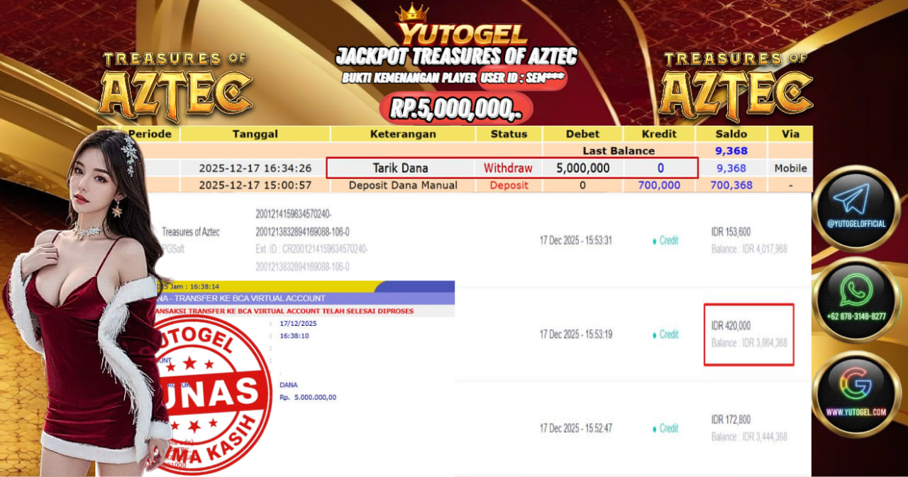 Selamat kepada USER ID : SEM**** Telah berhasil mendapatkan kemenangan besar pada YUTOGEL JACKPOT SLOT PGSOFT TREASURES OF AZTEC RP. 5.000.000,. – LUNAS. Setelah mengisi formulir withdraw dengan kurung waktu hanya 5 – 10 menit pihak  sudah melakukan transfer kepada pemilik User id dan dana sudah dapat dicairkan oleh pemenang. Bukti pembayaran yang kami berikan merupakan bukti pembayaran yang SAH/VALID yang langsung di dapatkan melalui tanda transfer transaksi dari Bank yang dituju.