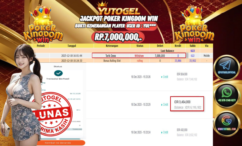 Selamat kepada USER ID : YUL**** Telah berhasil mendapatkan kemenangan besar pada YUTOGEL JACKPOT SLOT PGSOFT POKER KINGDOM WIN RP. 7.000.000,. – LUNAS. Setelah mengisi formulir withdraw dengan kurung waktu hanya 5 – 10 menit pihak sudah melakukan transfer kepada pemilik User id dan dana sudah dapat dicairkan oleh pemenang. Bukti pembayaran yang kami berikan merupakan bukti pembayaran yang SAH/VALID yang langsung di dapatkan melalui tanda transfer transaksi dari Bank yang dituju.