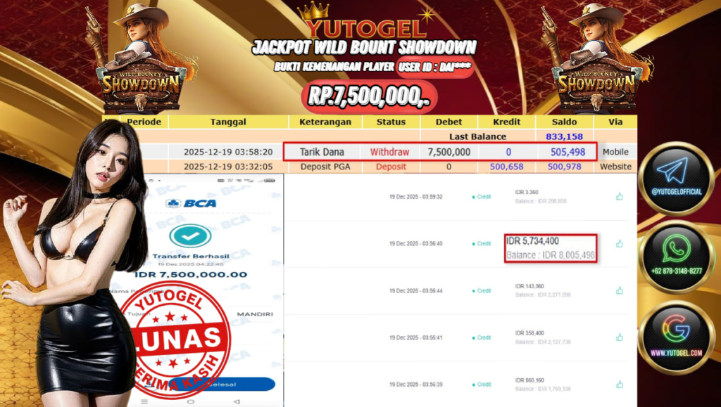 Selamat kepada USER ID : DAI**** Telah berhasil mendapatkan kemenangan besar pada YUTOGEL JACKPOT SLOT PGSOFT WILD BOUNTY SHOWDOWN RP. 7.500.000,. – LUNAS. Setelah mengisi formulir withdraw dengan kurung waktu hanya 5 – 10 menit pihak  sudah melakukan transfer kepada pemilik User id dan dana sudah dapat dicairkan oleh pemenang. Bukti pembayaran yang kami berikan merupakan bukti pembayaran yang SAH/VALID yang langsung di dapatkan melalui tanda transfer transaksi dari Bank yang dituju.