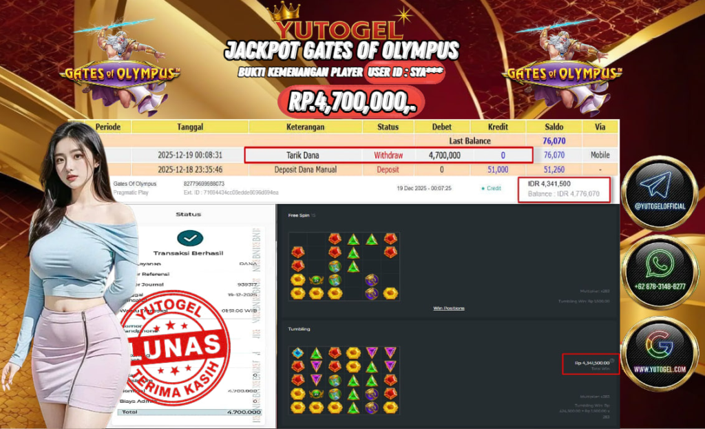 Selamat kepada USER ID : SYA*** Telah berhasil mendapatkan kemenangan besar pada YUTOGEL JACKPOT SLOT PRAGMATIC PLAY GATES OF OLYMPUS RP. 4.700.000,. – LUNAS. Setelah mengisi formulir withdraw dengan kurung waktu hanya 5 – 10 menit pihak  sudah melakukan transfer kepada pemilik Userid dan dana sudah dapat dicairkan oleh pemenang. Bukti pembayaran yang kami berikan merupakan bukti pembayaran yang SAH/VALID yang langsung di dapatkan melalui tanda transfer transaksi dari Bank yang dituju.