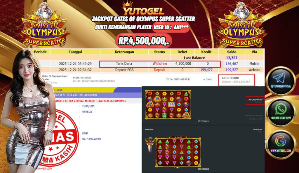Selamat kepada USER ID : ANI*** Telah berhasil mendapatkan kemenangan besar pada YUTOGEL JACKPOT SLOT PRAGMATIC PLAY GATES OF OLYMPUS SUPER SCATTER RP. 4.500.000,. – LUNAS. Setelah mengisi formulir withdraw dengan kurung waktu hanya 5 – 10 menit pihak sudah melakukan transfer kepada pemilik Userid dan dana sudah dapat dicairkan oleh pemenang. Bukti pembayaran yang kami berikan merupakan bukti pembayaran yang SAH/VALID yang langsung di dapatkan melalui tanda transfer transaksi dari Bank yang dituju.