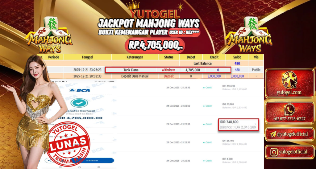 Selamat kepada USER ID : HEX**** Telah berhasil mendapatkan kemenangan besar pada YUTOGEL JACKPOT SLOT PGSOFT MAHJONG WAYS RP. 4.705.000,. – LUNAS. Setelah mengisi formulir withdraw dengan kurung waktu hanya 5 – 10 menit pihak  sudah melakukan transfer kepada pemilik User id dan dana sudah dapat dicairkan oleh pemenang. Bukti pembayaran yang kami berikan merupakan bukti pembayaran yang SAH/VALID yang langsung di dapatkan melalui tanda transfer transaksi dari Bank yang dituju.