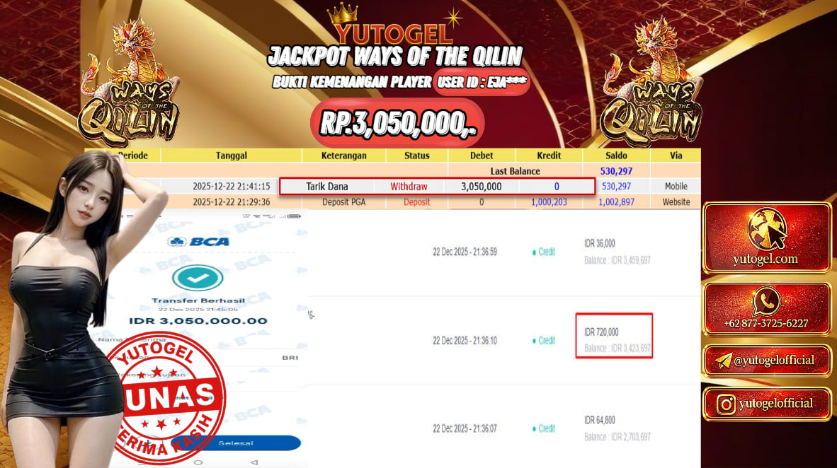 Selamat kepada USER ID : EJA**** Telah berhasil mendapatkan kemenangan besar pada YUTOGEL JACKPOT SLOT PGSOFT WAYS OF THE QILIN RP. 3.050.000,. – LUNAS. Setelah mengisi formulir withdraw dengan kurung waktu hanya 5 – 10 menit pihak sudah melakukan transfer kepada pemilik User id dan dana sudah dapat dicairkan oleh pemenang. Bukti pembayaran yang kami berikan merupakan bukti pembayaran yang SAH/VALID yang langsung di dapatkan melalui tanda transfer transaksi dari Bank yang dituju.