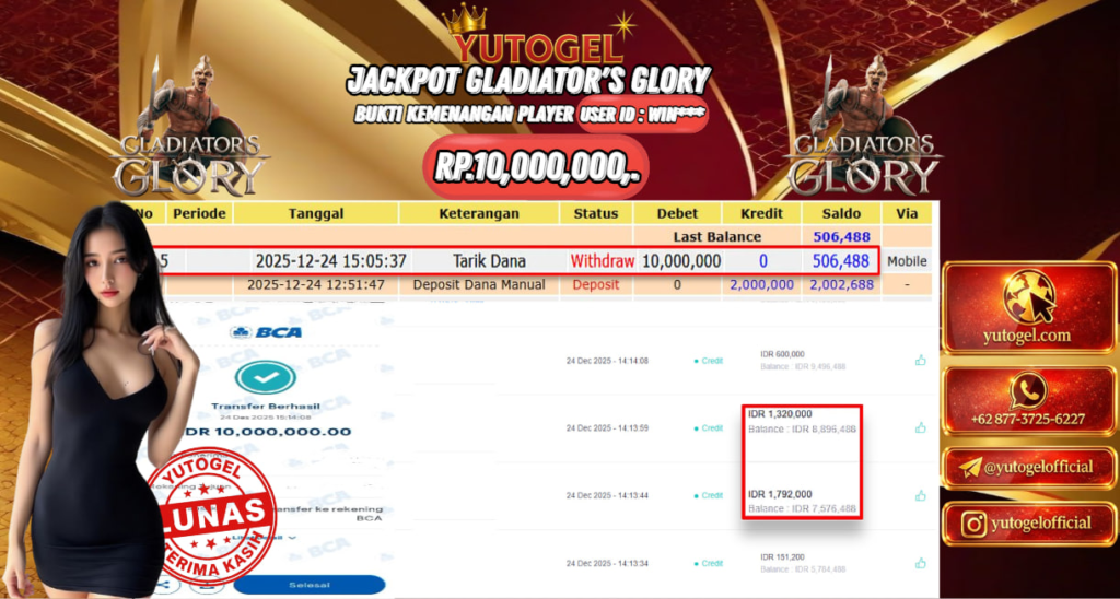 Selamat kepada USER ID : WIN**** Telah berhasil mendapatkan kemenangan besar pada YUTOGEL JACKPOT SLOT PGSOFT GLADIATOR’S GLORY RP. 10.000.000,. – LUNAS. Setelah mengisi formulir withdraw dengan kurung waktu hanya 5 – 10 menit pihak sudah melakukan transfer kepada pemilik User id dan dana sudah dapat dicairkan oleh pemenang. Bukti pembayaran yang kami berikan merupakan bukti pembayaran yang SAH/VALID yang langsung di dapatkan melalui tanda transfer transaksi dari Bank yang dituju.