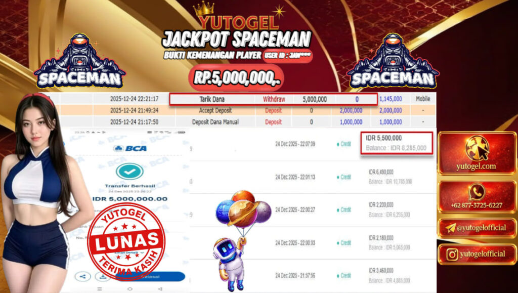 Selamat kepada USER ID : JAW*** Telah berhasil mendapatkan kemenangan besar pada YUTOGEL JACKPOT SLOT PRAGMATIC PLAY SPACEMAN 1000 RP. 5.000.000,. – LUNAS. Setelah mengisi formulir withdraw dengan kurung waktu hanya 5 – 10 menit pihak  sudah melakukan transfer kepada pemilik Userid dan dana sudah dapat dicairkan oleh pemenang. Bukti pembayaran yang kami berikan merupakan bukti pembayaran yang SAH/VALID yang langsung di dapatkan melalui tanda transfer transaksi dari Bank yang dituju.