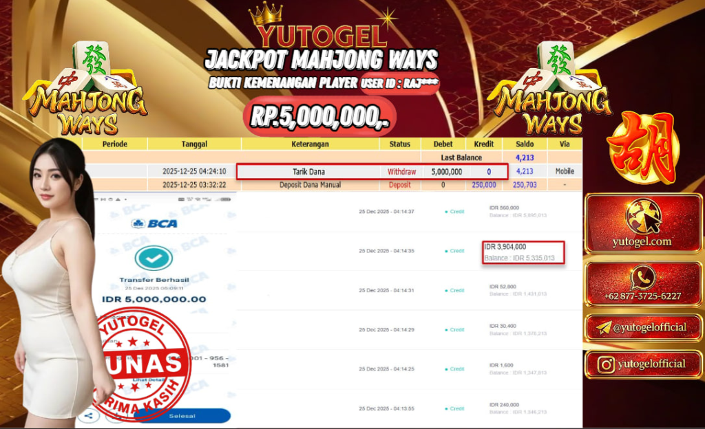 Selamat kepada USER ID : RAJ**** Telah berhasil mendapatkan kemenangan besar pada YUTOGEL JACKPOT SLOT PGSOFT MAHJONG WAYS RP. 5.000.000,. – LUNAS. Setelah mengisi formulir withdraw dengan kurung waktu hanya 5 – 10 menit pihak  sudah melakukan transfer kepada pemilik User id dan dana sudah dapat dicairkan oleh pemenang. Bukti pembayaran yang kami berikan merupakan bukti pembayaran yang SAH/VALID yang langsung di dapatkan melalui tanda transfer transaksi dari Bank yang dituju.