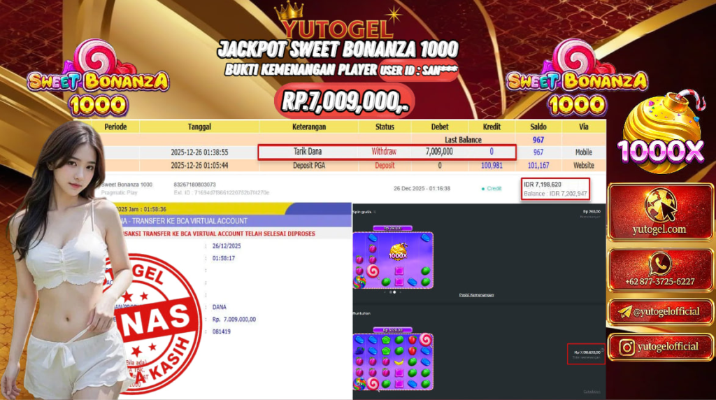 Selamat kepada USER ID : SAN*** Telah berhasil mendapatkan kemenangan besar pada YUTOGEL JACKPOT SLOT PRAGMATIC PLAY SWEET BONANZA 1000 RP. 7.009.000,. – LUNAS. Setelah mengisi formulir withdraw dengan kurung waktu hanya 5 – 10 menit pihak  sudah melakukan transfer kepada pemilik Userid dan dana sudah dapat dicairkan oleh pemenang. Bukti pembayaran yang kami berikan merupakan bukti pembayaran yang SAH/VALID yang langsung di dapatkan melalui tanda transfer transaksi dari Bank yang dituju.