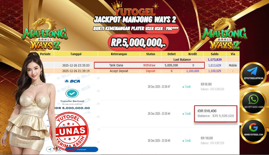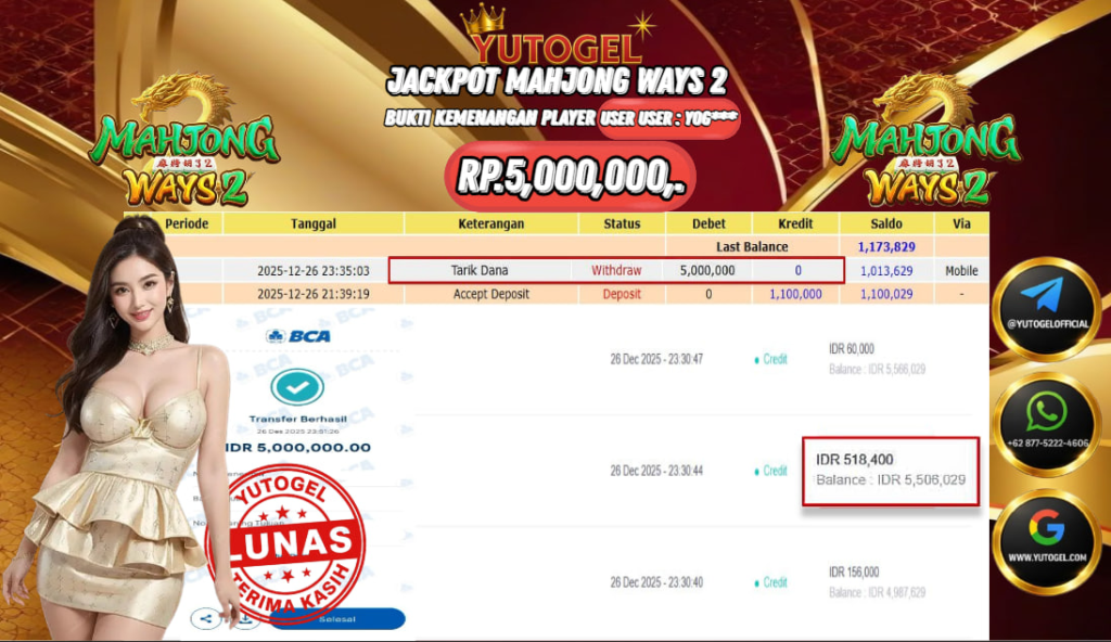Selamat kepada USER ID : YOG**** Telah berhasil mendapatkan kemenangan besar pada YUTOGEL JACKPOT SLOT PGSOFT MAHJONG WAYS 2 RP. 5.000.000,. – LUNAS. Setelah mengisi formulir withdraw dengan kurung waktu hanya 5 – 10 menit pihak sudah melakukan transfer kepada pemilik User id dan dana sudah dapat dicairkan oleh pemenang. Bukti pembayaran yang kami berikan merupakan bukti pembayaran yang SAH/VALID yang langsung di dapatkan melalui tanda transfer transaksi dari Bank yang dituju.