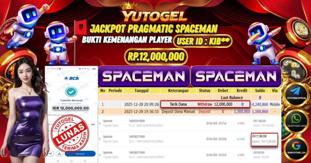 Selamat kepada USER ID : KIB*** Telah berhasil mendapatkan kemenangan besar pada YUTOGEL JACKPOT SLOT PRAGMATIC CASINO SPACEMAN RP. 12.000.000,. – LUNAS. Setelah mengisi formulir withdraw dengan kurung waktu hanya 5 – 10 menit pihak sudah melakukan transfer kepada pemilik Userid dan dana sudah dapat dicairkan oleh pemenang. Bukti pembayaran yang kami berikan merupakan bukti pembayaran yang SAH/VALID yang langsung di dapatkan melalui tanda transfer transaksi dari Bank yang dituju.