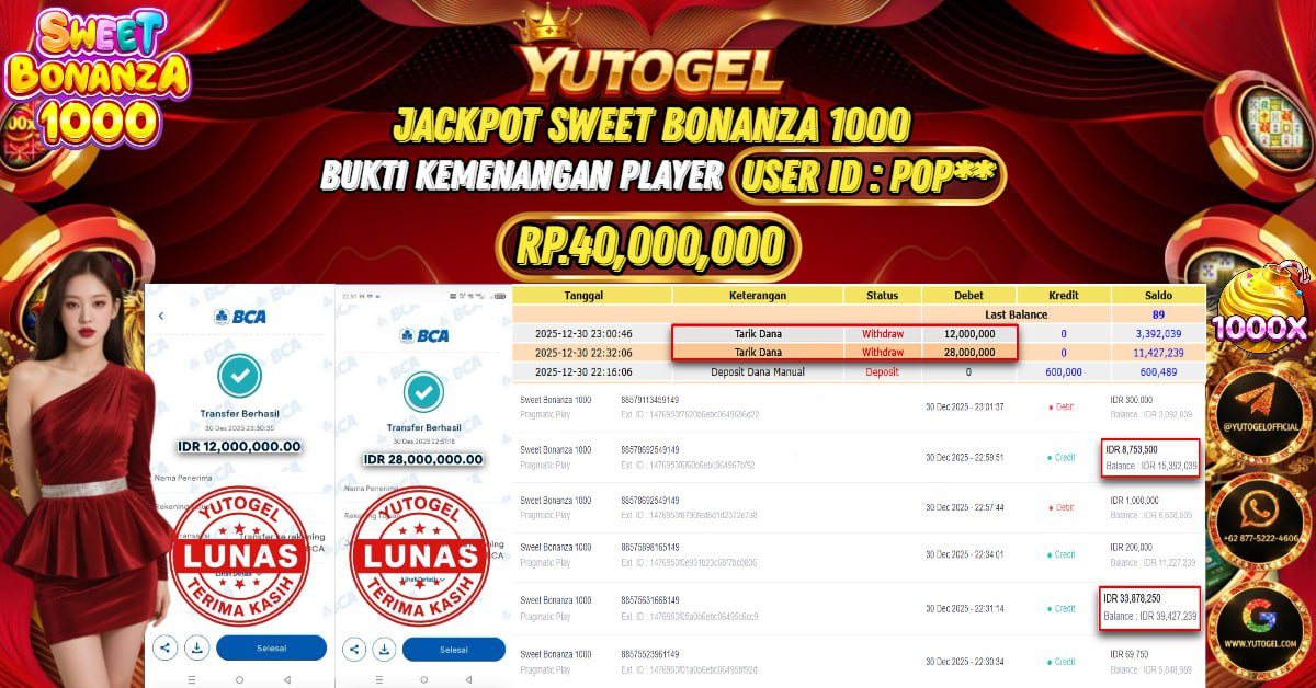 Selamat kepada USER ID : POP*** Telah berhasil mendapatkan kemenangan besar pada YUTOGEL JACKPOT SLOT PRAGMATIC PLAY SWEET BONANZA 1000 RP. 40.000.000,. – LUNAS. Setelah mengisi formulir withdraw dengan kurung waktu hanya 5 – 10 menit pihak sudah melakukan transfer kepada pemilik Userid dan dana sudah dapat dicairkan oleh pemenang. Bukti pembayaran yang kami berikan merupakan bukti pembayaran yang SAH/VALID yang langsung di dapatkan melalui tanda transfer transaksi dari Bank yang dituju.
