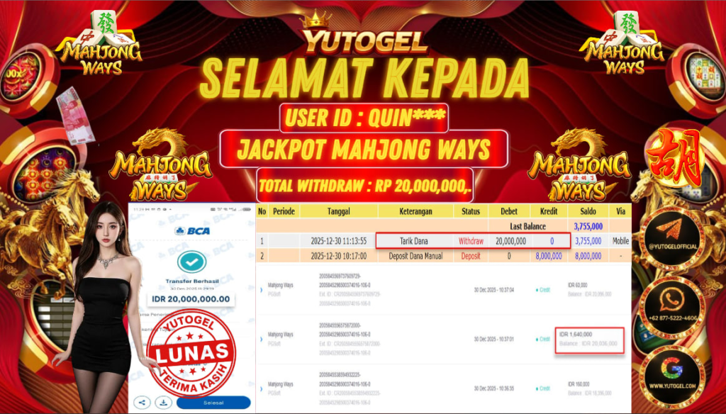 Selamat kepada USER ID : QUIN**** Telah berhasil mendapatkan kemenangan besar pada YUTOGEL JACKPOT SLOT PGSOFT MAHJONG WAYS RP. 20.000.000,. – LUNAS. Setelah mengisi formulir withdraw dengan kurung waktu hanya 5 – 10 menit pihak  sudah melakukan transfer kepada pemilik User id dan dana sudah dapat dicairkan oleh pemenang. Bukti pembayaran yang kami berikan merupakan bukti pembayaran yang SAH/VALID yang langsung di dapatkan melalui tanda transfer transaksi dari Bank yang dituju.