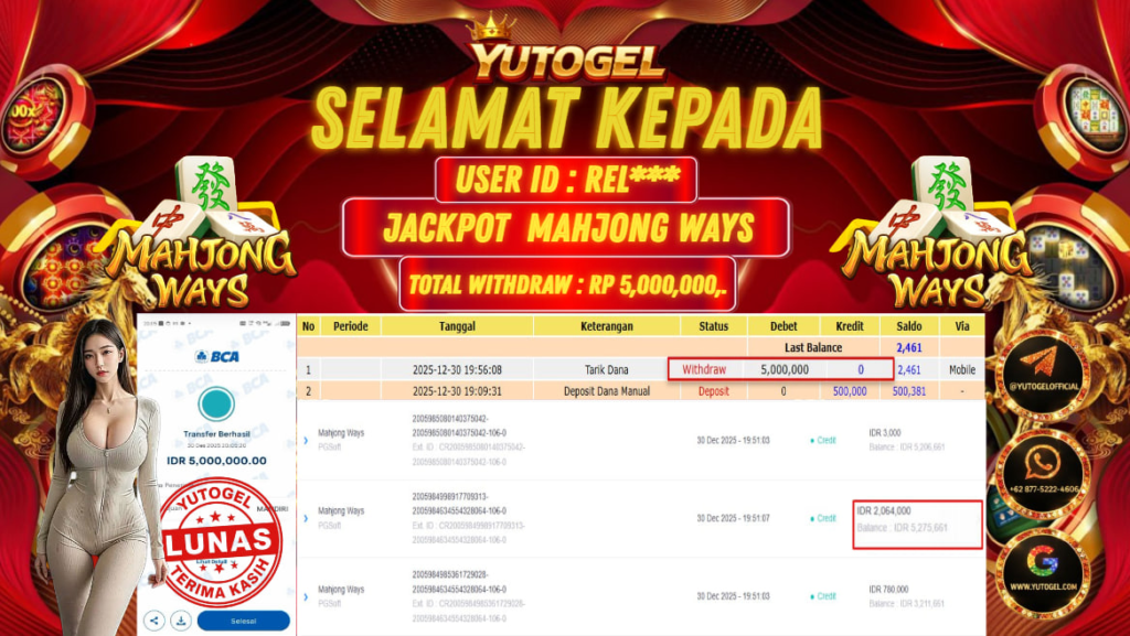 Selamat kepada USER ID : REL*** Telah berhasil mendapatkan kemenangan besar pada YUTOGEL JACKPOT SLOT PGSOFT MAHJONG WAYS RP. 5.000.000,. – LUNAS. Setelah mengisi formulir withdraw dengan kurung waktu hanya 5 – 10 menit pihak sudah melakukan transfer kepada pemilik User id dan dana sudah dapat dicairkan oleh pemenang. Bukti pembayaran yang kami berikan merupakan bukti pembayaran yang SAH/VALID yang langsung di dapatkan melalui tanda transfer transaksi dari Bank yang dituju.