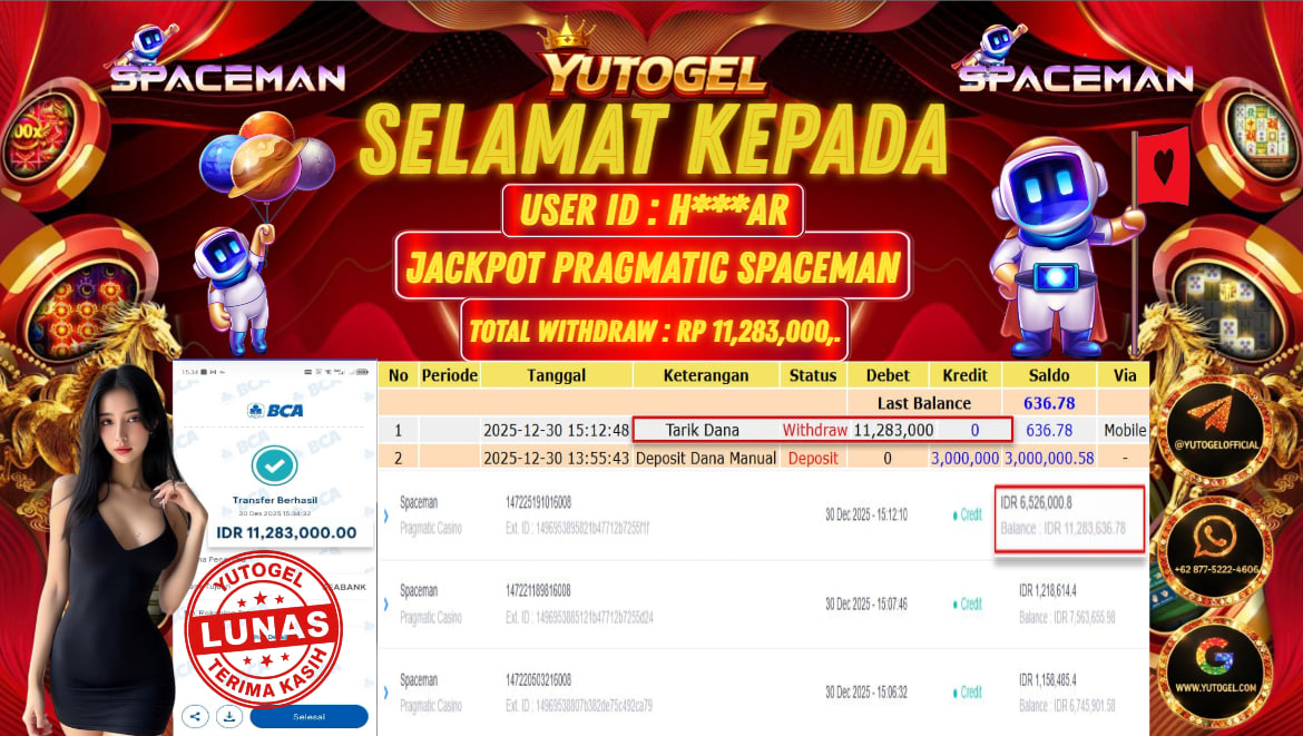Selamat kepada USER ID : H***AR Telah berhasil mendapatkan kemenangan besar pada YUTOGEL JACKPOT SLOT PRAGMATIC CASINO SPACEMAN RP. 11.283.000,. – LUNAS. Setelah mengisi formulir withdraw dengan kurung waktu hanya 5 – 10 menit pihak sudah melakukan transfer kepada pemilik Userid dan dana sudah dapat dicairkan oleh pemenang. Bukti pembayaran yang kami berikan merupakan bukti pembayaran yang SAH/VALID yang langsung di dapatkan melalui tanda transfer transaksi dari Bank yang dituju.