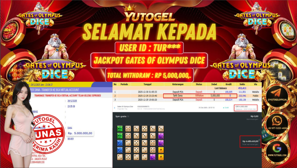 Selamat kepada USER ID : TUR*** Telah berhasil mendapatkan kemenangan besar pada YUTOGEL JACKPOT SLOT PRAGMATIC GATES OF OLYMPUS DICE RP. 5.000.000,. – LUNAS. Setelah mengisi formulir withdraw dengan kurung waktu hanya 5 – 10 menit pihak  sudah melakukan transfer kepada pemilik Userid dan dana sudah dapat dicairkan oleh pemenang. Bukti pembayaran yang kami berikan merupakan bukti pembayaran yang SAH/VALID yang langsung di dapatkan melalui tanda transfer transaksi dari Bank yang dituju.