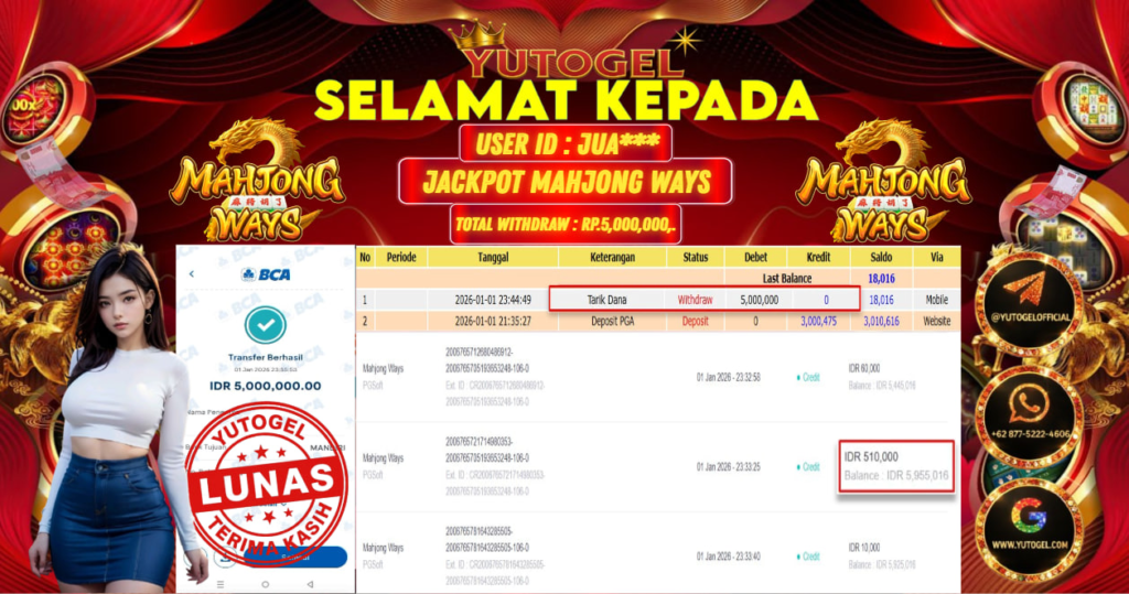 Selamat kepada USER ID : JUA*** Telah berhasil mendapatkan kemenangan besar pada YUTOGEL JACKPOT SLOT PGSOFT MAHJONG WAYS RP. 5.000.000,. – LUNAS. Setelah mengisi formulir withdraw dengan kurung waktu hanya 5 – 10 menit pihak sudah melakukan transfer kepada pemilik User id dan dana sudah dapat dicairkan oleh pemenang. Bukti pembayaran yang kami berikan merupakan bukti pembayaran yang SAH/VALID yang langsung di dapatkan melalui tanda transfer transaksi dari Bank yang dituju.