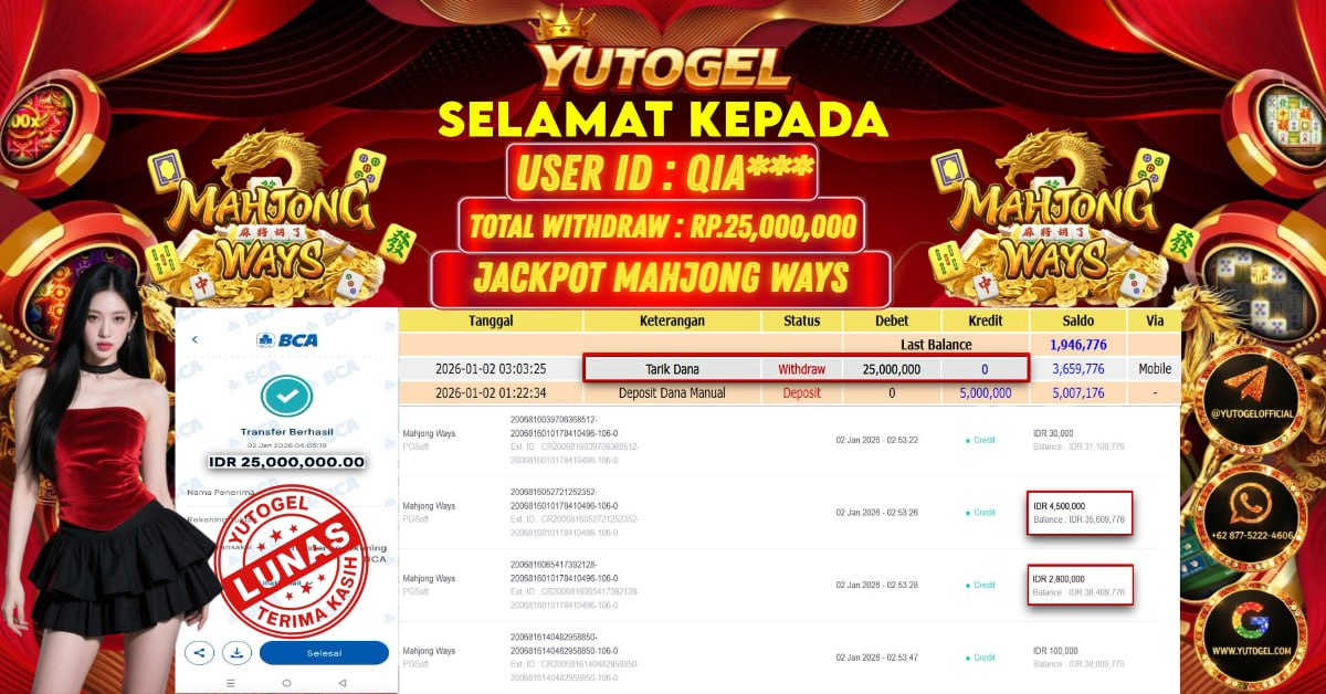 Selamat kepada USER ID : QIA*** Telah berhasil mendapatkan kemenangan besar pada YUTOGEL JACKPOT SLOT PGSOFT MAHJONG WAYS RP. 25.000.000,. – LUNAS. Setelah mengisi formulir withdraw dengan kurung waktu hanya 5 – 10 menit pihak sudah melakukan transfer kepada pemilik User id dan dana sudah dapat dicairkan oleh pemenang. Bukti pembayaran yang kami berikan merupakan bukti pembayaran yang SAH/VALID yang langsung di dapatkan melalui tanda transfer transaksi dari Bank yang dituju.