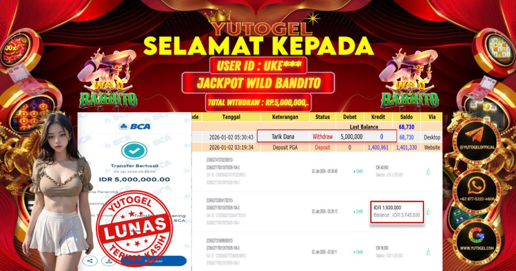 Selamat kepada USER ID : UKE*** Telah berhasil mendapatkan kemenangan besar pada YUTOGEL JACKPOT SLOT PGSOFT WILD BANDITO RP. 5.000.000,. – LUNAS. Setelah mengisi formulir withdraw dengan kurung waktu hanya 5 – 10 menit pihak sudah melakukan transfer kepada pemilik User id dan dana sudah dapat dicairkan oleh pemenang. Bukti pembayaran yang kami berikan merupakan bukti pembayaran yang SAH/VALID yang langsung di dapatkan melalui tanda transfer transaksi dari Bank yang dituju.