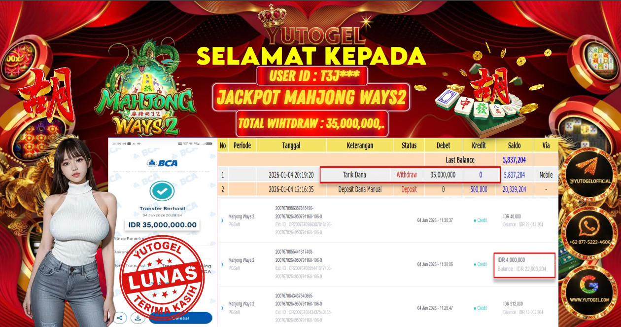 Selamat kepada USER ID : T3J*** Telah berhasil mendapatkan kemenangan besar pada YUTOGEL JACKPOT SLOT PGSOFT MAHJONG 2 WAYS RP. 35.000.000,. – LUNAS. Setelah mengisi formulir withdraw dengan kurung waktu hanya 5 – 10 menit pihak sudah melakukan transfer kepada pemilik User id dan dana sudah dapat dicairkan oleh pemenang. Bukti pembayaran yang kami berikan merupakan bukti pembayaran yang SAH/VALID yang langsung di dapatkan melalui tanda transfer transaksi dari Bank yang dituju.