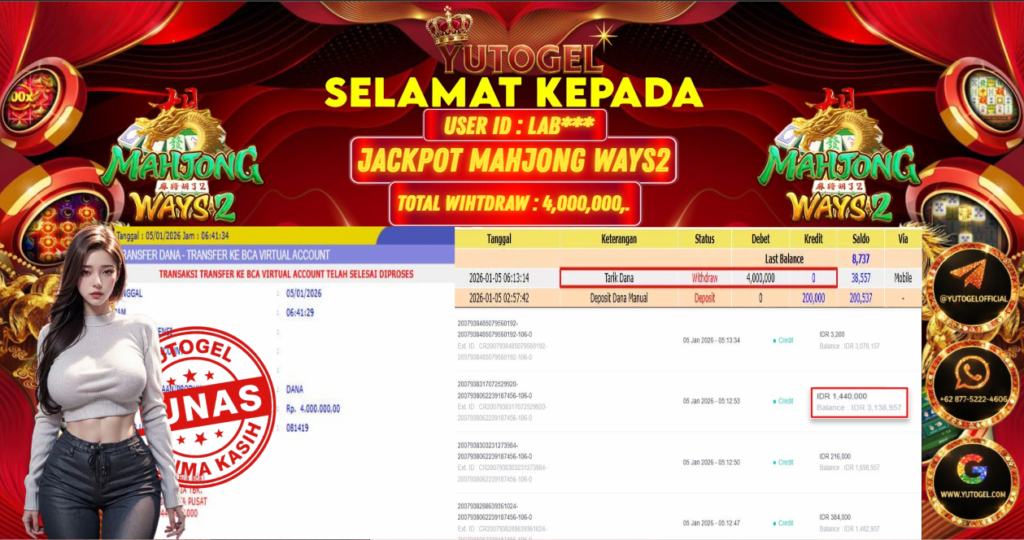 Selamat kepada USER ID : LAB*** Telah berhasil mendapatkan kemenangan besar pada YUTOGEL JACKPOT SLOT PGSOFT MAHJONG 2 WAYS RP. 4.000.000,. – LUNAS. Setelah mengisi formulir withdraw dengan kurung waktu hanya 5 – 10 menit pihak sudah melakukan transfer kepada pemilik User id dan dana sudah dapat dicairkan oleh pemenang. Bukti pembayaran yang kami berikan merupakan bukti pembayaran yang SAH/VALID yang langsung di dapatkan melalui tanda transfer transaksi dari Bank yang dituju.