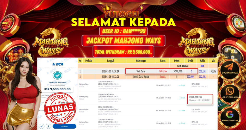 Selamat kepada USER ID : BAN***99 Telah berhasil mendapatkan kemenangan besar pada YUTOGEL JACKPOT SLOT PGSOFT MAHJONG WAYS RP. 9.500.000,. – LUNAS. Setelah mengisi formulir withdraw dengan kurung waktu hanya 5 – 10 menit pihak sudah melakukan transfer kepada pemilik User id dan dana sudah dapat dicairkan oleh pemenang. Bukti pembayaran yang kami berikan merupakan bukti pembayaran yang SAH/VALID yang langsung di dapatkan melalui tanda transfer transaksi dari Bank yang dituju.