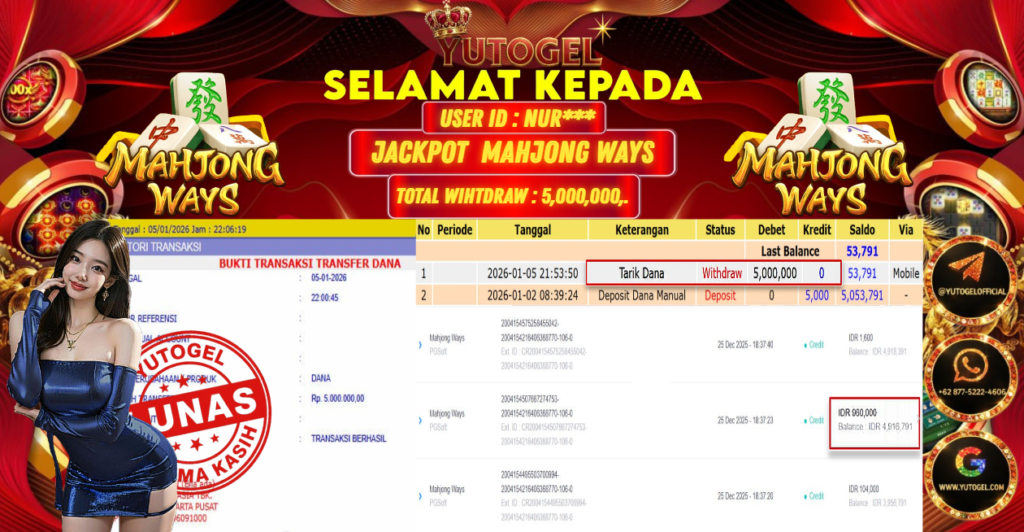 Selamat kepada USER ID : NUR*** Telah berhasil mendapatkan kemenangan besar pada YUTOGEL JACKPOT SLOT PGSOFT MAHJONG WAYS RP. 5.000.000,. – LUNAS. Setelah mengisi formulir withdraw dengan kurung waktu hanya 5 – 10 menit pihak sudah melakukan transfer kepada pemilik User id dan dana sudah dapat dicairkan oleh pemenang. Bukti pembayaran yang kami berikan merupakan bukti pembayaran yang SAH/VALID yang langsung di dapatkan melalui tanda transfer transaksi dari Bank yang dituju.