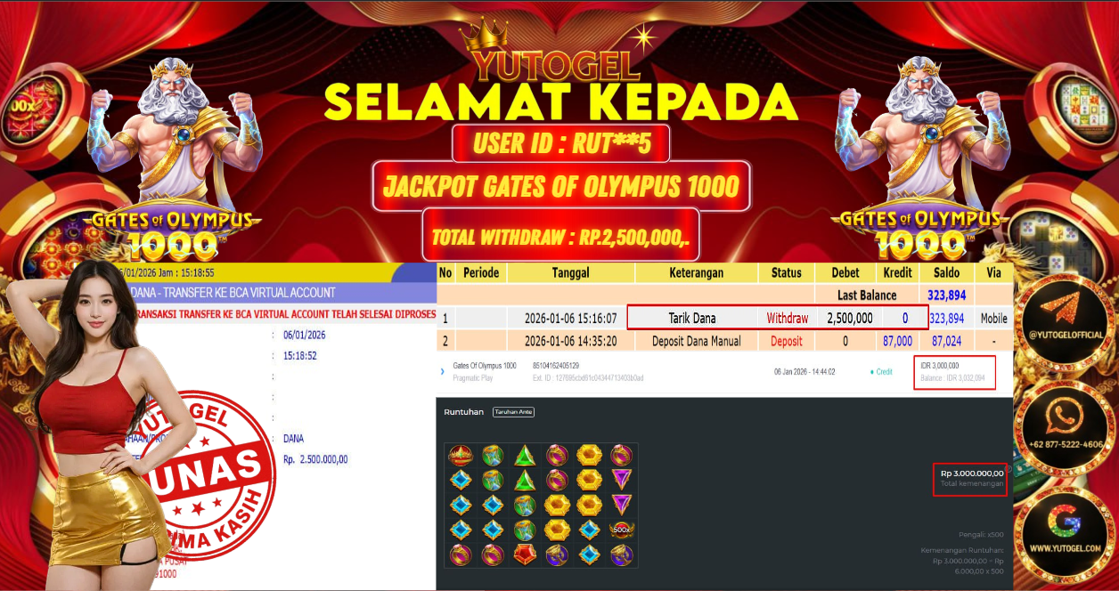 Selamat kepada USER ID : RUT**5 Telah berhasil mendapatkan kemenangan besar pada YUTOGEL JACKPOT SLOT PRAGMATIC GATES OF OLYMPUS 1000 RP. 2.500.000,. – LUNAS. Setelah mengisi formulir withdraw dengan kurung waktu hanya 5 – 10 menit pihak sudah melakukan transfer kepada pemilik User id dan dana sudah dapat dicairkan oleh pemenang. Bukti pembayaran yang kami berikan merupakan bukti pembayaran yang SAH/VALID yang langsung di dapatkan melalui tanda transfer transaksi dari Bank yang dituju.