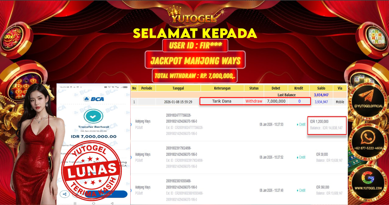 Selamat kepada USER ID : FIR*** Telah berhasil mendapatkan kemenangan besar pada YUTOGEL JACKPOT SLOT PGSOFT MAHJONG WAYS RP. 7.000.000,. – LUNAS. Setelah mengisi formulir withdraw dengan kurung waktu hanya 5 – 10 menit pihak sudah melakukan transfer kepada pemilik User id dan dana sudah dapat dicairkan oleh pemenang. Bukti pembayaran yang kami berikan merupakan bukti pembayaran yang SAH/VALID yang langsung di dapatkan melalui tanda transfer transaksi dari Bank yang dituju.