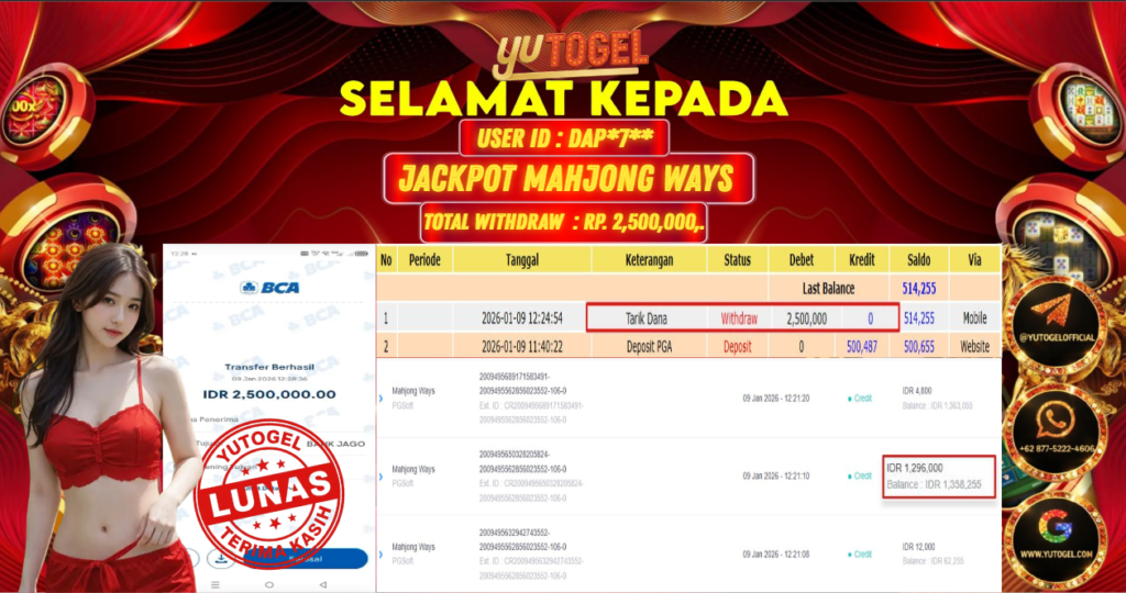Selamat kepada USER ID : DAP*7** Telah berhasil mendapatkan kemenangan besar pada YUTOGEL JACKPOT SLOT PGSOFT MAHJONG WAYS RP. 2.500.000,. – LUNAS. Setelah mengisi formulir withdraw dengan kurung waktu hanya 5 – 10 menit pihak sudah melakukan transfer kepada pemilik User id dan dana sudah dapat dicairkan oleh pemenang. Bukti pembayaran yang kami berikan merupakan bukti pembayaran yang SAH/VALID yang langsung di dapatkan melalui tanda transfer transaksi dari Bank yang dituju.