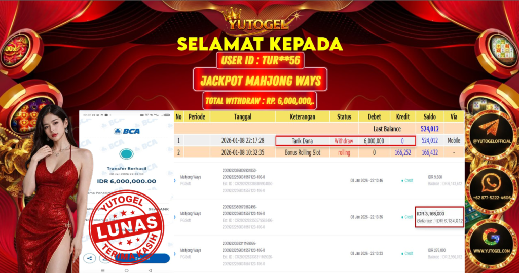 Selamat kepada USER ID : TUR**56 Telah berhasil mendapatkan kemenangan besar pada YUTOGEL JACKPOT SLOT PGSOFT MAHJONG WAYS RP. 6.000.000,. – LUNAS. Setelah mengisi formulir withdraw dengan kurung waktu hanya 5 – 10 menit pihak sudah melakukan transfer kepada pemilik User id dan dana sudah dapat dicairkan oleh pemenang. Bukti pembayaran yang kami berikan merupakan bukti pembayaran yang SAH/VALID yang langsung di dapatkan melalui tanda transfer transaksi dari Bank yang dituju.