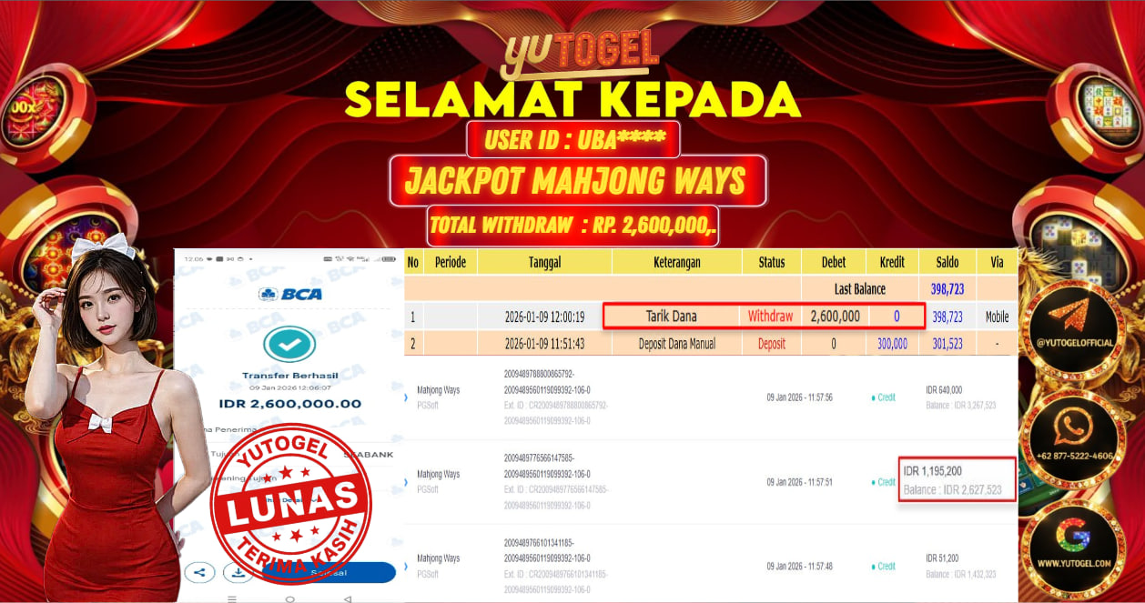 Selamat kepada USER ID : UBA**** Telah berhasil mendapatkan kemenangan besar pada YUTOGEL JACKPOT SLOT PGSOFT MAHJONG WAYS RP. 2.600.000,. – LUNAS. Setelah mengisi formulir withdraw dengan kurung waktu hanya 5 – 10 menit pihak sudah melakukan transfer kepada pemilik User id dan dana sudah dapat dicairkan oleh pemenang. Bukti pembayaran yang kami berikan merupakan bukti pembayaran yang SAH/VALID yang langsung di dapatkan melalui tanda transfer transaksi dari Bank yang dituju.
