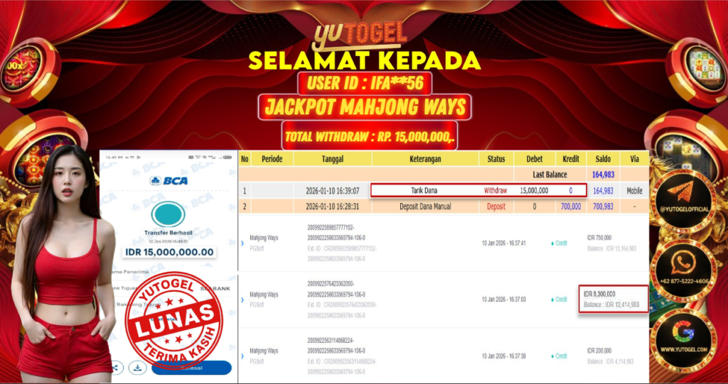 Selamat kepada USER ID : IFA**56 Telah berhasil mendapatkan kemenangan besar pada YUTOGEL JACKPOT SLOT PGSOFT MAHJONG WAYS RP. 15.000.000,. – LUNAS. Setelah mengisi formulir withdraw dengan kurung waktu hanya 5 – 10 menit pihak sudah melakukan transfer kepada pemilik User id dan dana sudah dapat dicairkan oleh pemenang. Bukti pembayaran yang kami berikan merupakan bukti pembayaran yang SAH/VALID yang langsung di dapatkan melalui tanda transfer transaksi dari Bank yang dituju.